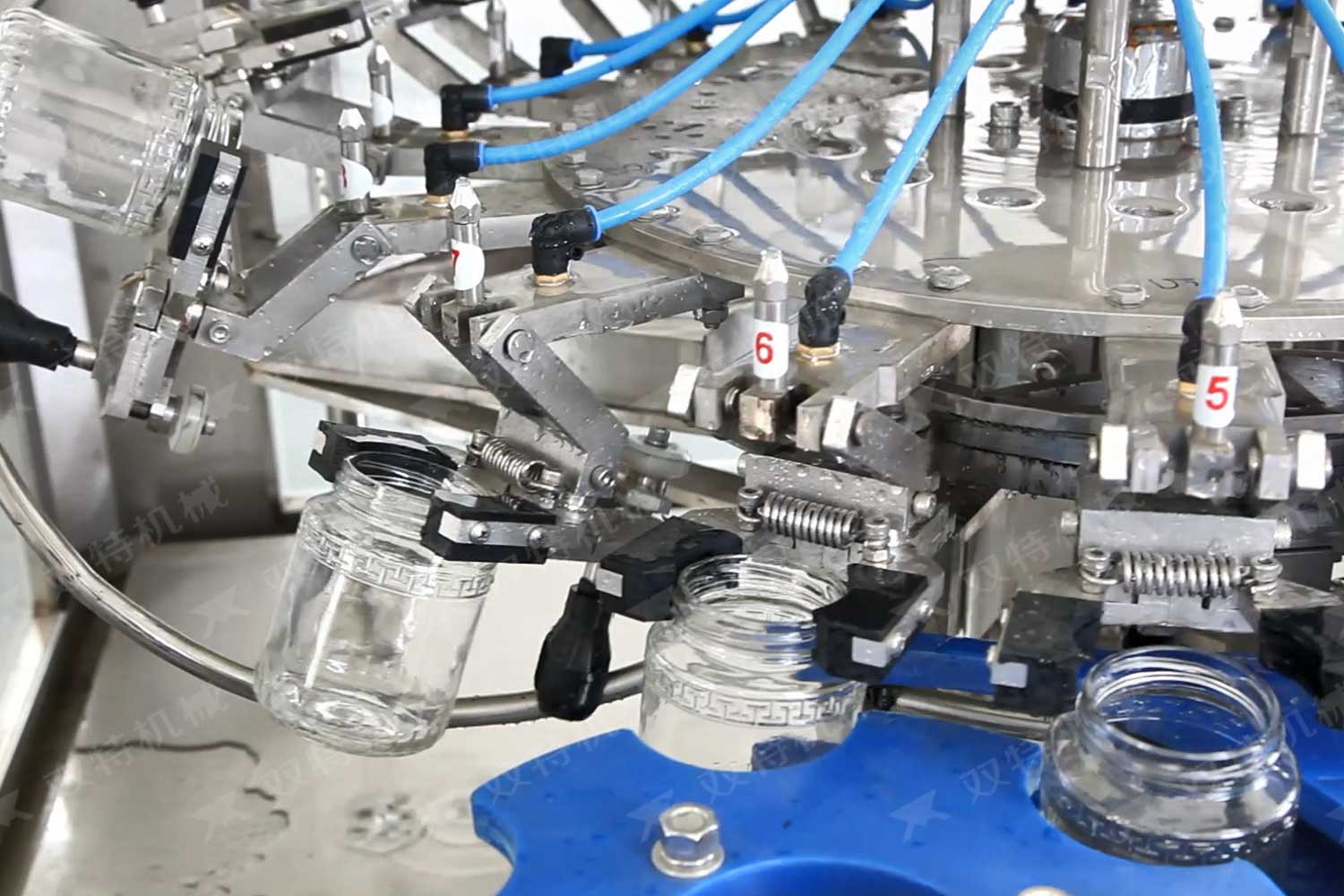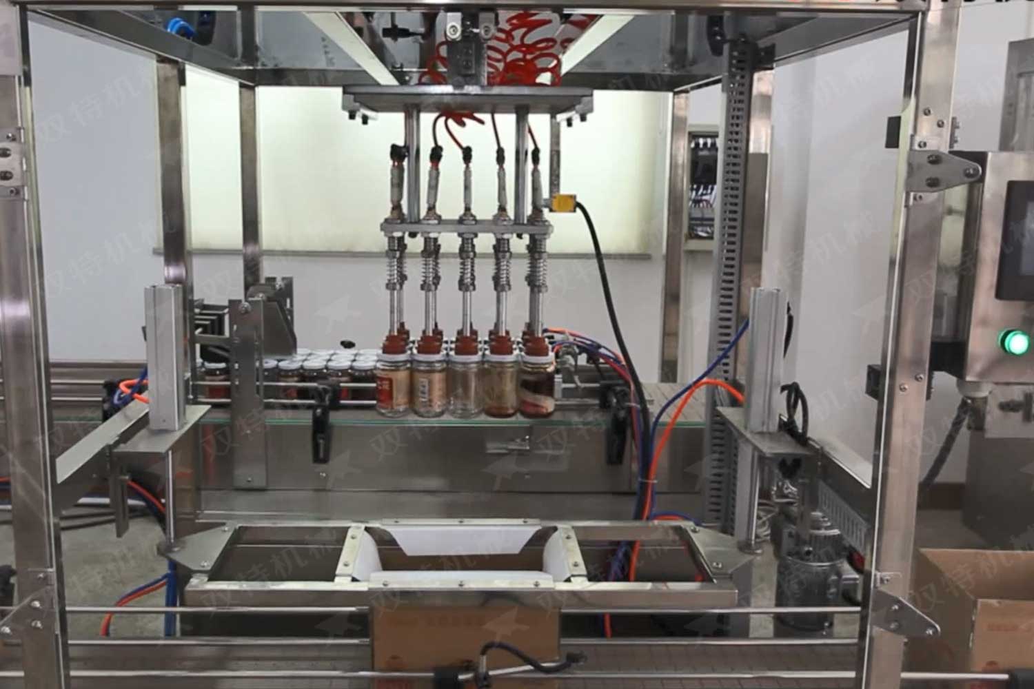 旋蓋機主要用于玻璃廣口瓶的三、四、六鐵蓋真空旋蓋,用兩根不同速度的皮帶壓瓶蓋,因兩根皮帶的速度不同,對蓋進行搓蓋收緊達到旋蓋目的。在自動上蓋之前對瓶口吹蒸汽加熱,吹掉冷空氣,換上高溫蒸汽,立即旋蓋,根據(jù)熱脹冷縮原理,蒸汽冷下來就自然形成了瓶內(nèi)真空,達到了真空旋蓋的目的。自動旋蓋機可以和濃醬灌裝機、蜂蜜灌裝機、辣椒醬灌裝機組合在一起,形成一套全自動灌裝設(shè)備,是現(xiàn)代調(diào)味品企業(yè)的得力幫手。